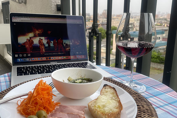 狭いベランダに小さなテーブルと椅子が2脚。テーブルにクロスをかけることもありますが、リゾートのテラス席をイメージしてラタンのアンダープレートをよく使います。日常と少し違う色使い、食器を使うのが気分を上げるコツのようです。